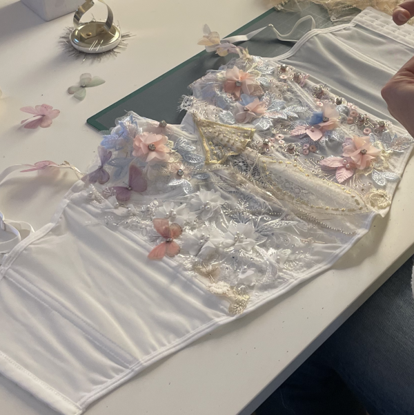 Vous vous emparerez ensuite de ciseaux, de fils et d'aiguilles pour coudre les motifs choisis sur votre corset. Les textures et les couleurs se mélangeront jusqu'à former une œuvre unique et personnelle.