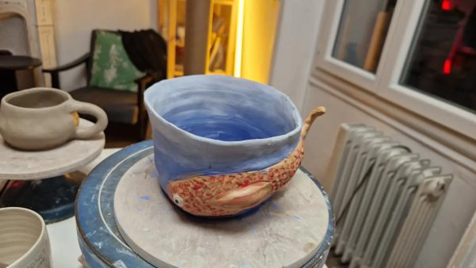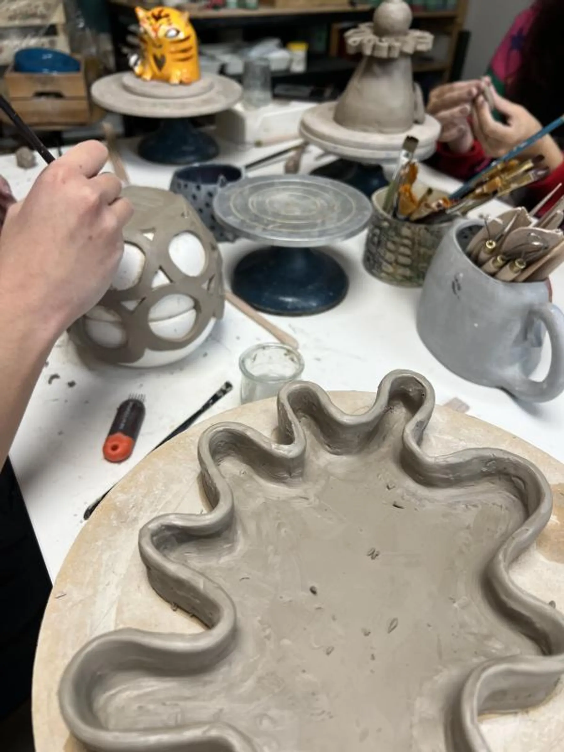 Mais l'aventure ne s'arrête pas là ! Après l'atelier, vos œuvres seront cuites deux fois dans le four et émaillées pour leur donner leur forme finale. Vous pourrez revenir chercher vos créations environ 3 semaines plus tard.