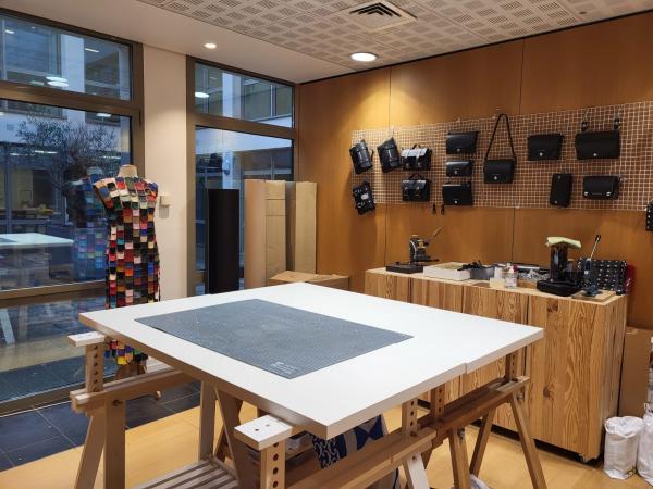 Raùl vous présentera la star de l'atelier : le cuir noir recyclé, prêt à se métamorphoser en une pièce de maroquinerie unique. Ce cuir est composé à 80% de cuir, et 20% de latex.