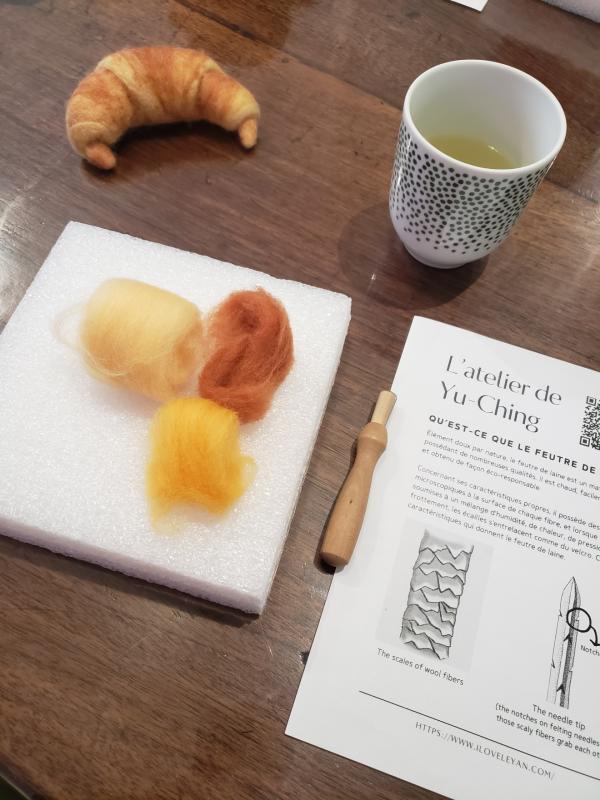 Merci à vous deux pour ce superbe atelier auquel j'ai pris plaisir à participer. Votre accueil était chaleureux et l'ambiance très agréable. Le petit thé offert était délicieux. Cela faisait longtemps que je souhaitais apprendre à faire des réalisations en laine cardée et grâce à vous c'est chose fait. Merci à Yu-Ching pour toute la pédagogie dont vous faites preuve et à votre compagnon (dont je n'ai malheureusement pas retenu le nom) pour sa touche d'humour. Mon petit croissant trône fièrement sur mon étagère. Merci beaucoup ^^