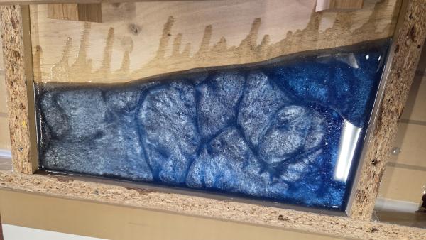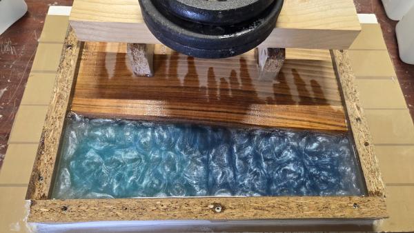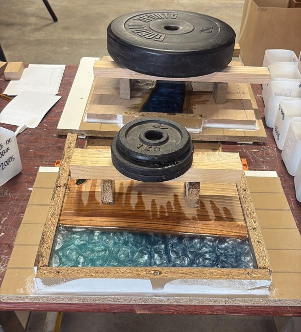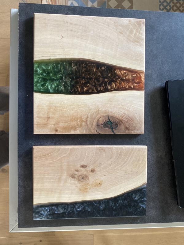 Belle découverte pour moi ! Après avoir choisi les morceaux de bois, Enzo explique les différentes étapes et nous guide. Visseuse, polycarbonate, silicone, résine, durcisseur, pigments, on touche à tout en ajoutant une petite dose de calcul ! Beau résultat, je recommande vivement !