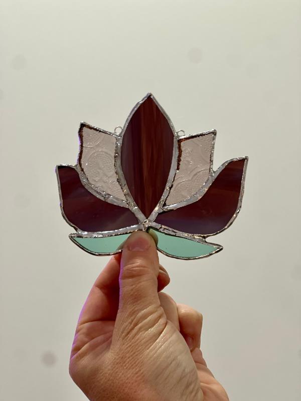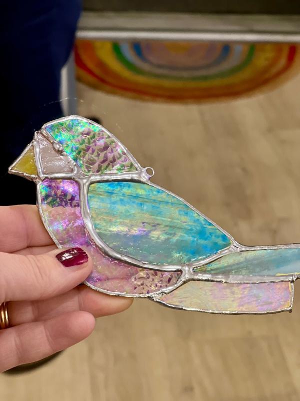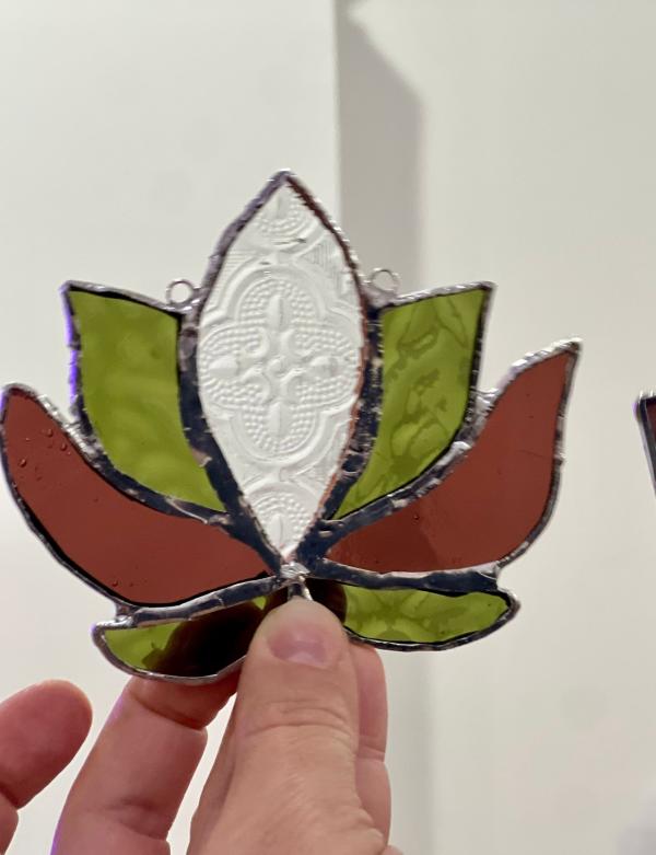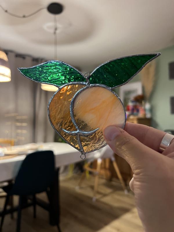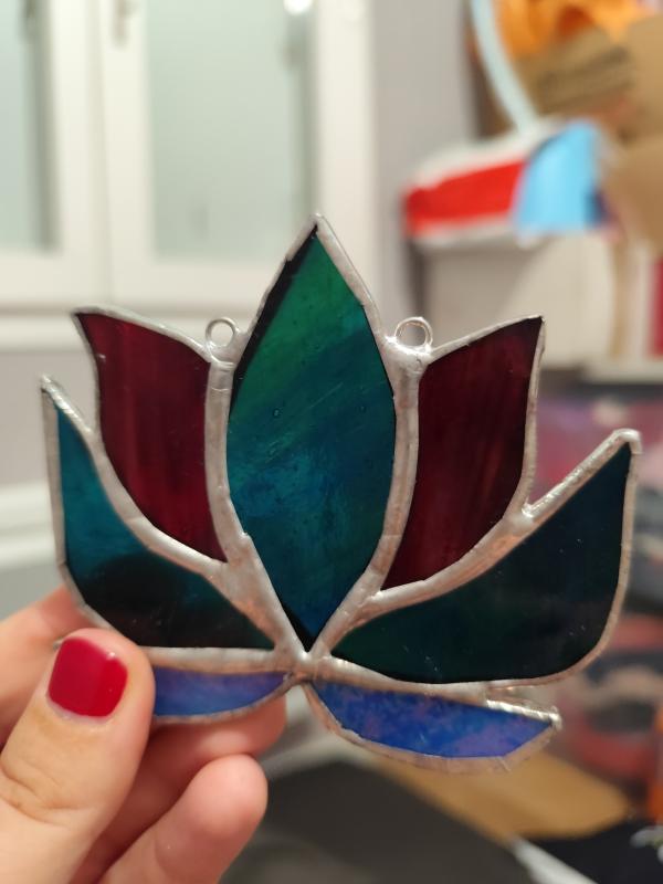 Très satisfaite de mon expérience avec Aurélie. On fait vraiment tout de A à Z (sauf le patron du modèle). On repart avec sa pièce à la fin de la séance, ce qui est très gratifiant ! J'y ai ajouté des pampilles à la maison pour en faire un attrape-soleil. Merci Aurélie pour ce premier pas dans le monde du vitrail