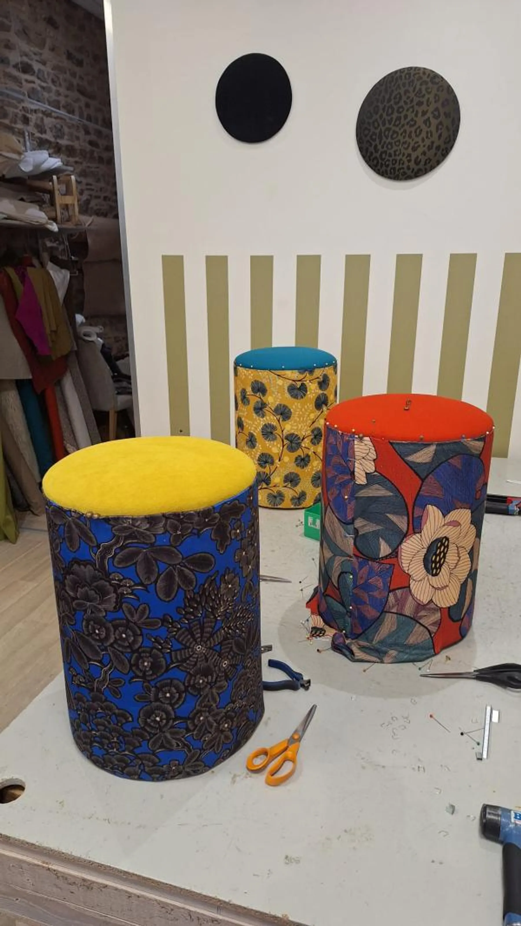 Ravie d'avoir passé cet après midi en compagnie de Laurianne de "Sit down Simone" et de deux autres participantes. J'ai adoré l'atelier, je suis fan de mon pouf. Les tissus sont trop chouettes, y'a un large choix c'est top! Merci pour l'accueil, l'apprentissage et surtout les rectifications de cloutage sans oublier la petite tisane qui réchauffe 🥰! Sincère merci pour cet découverte.