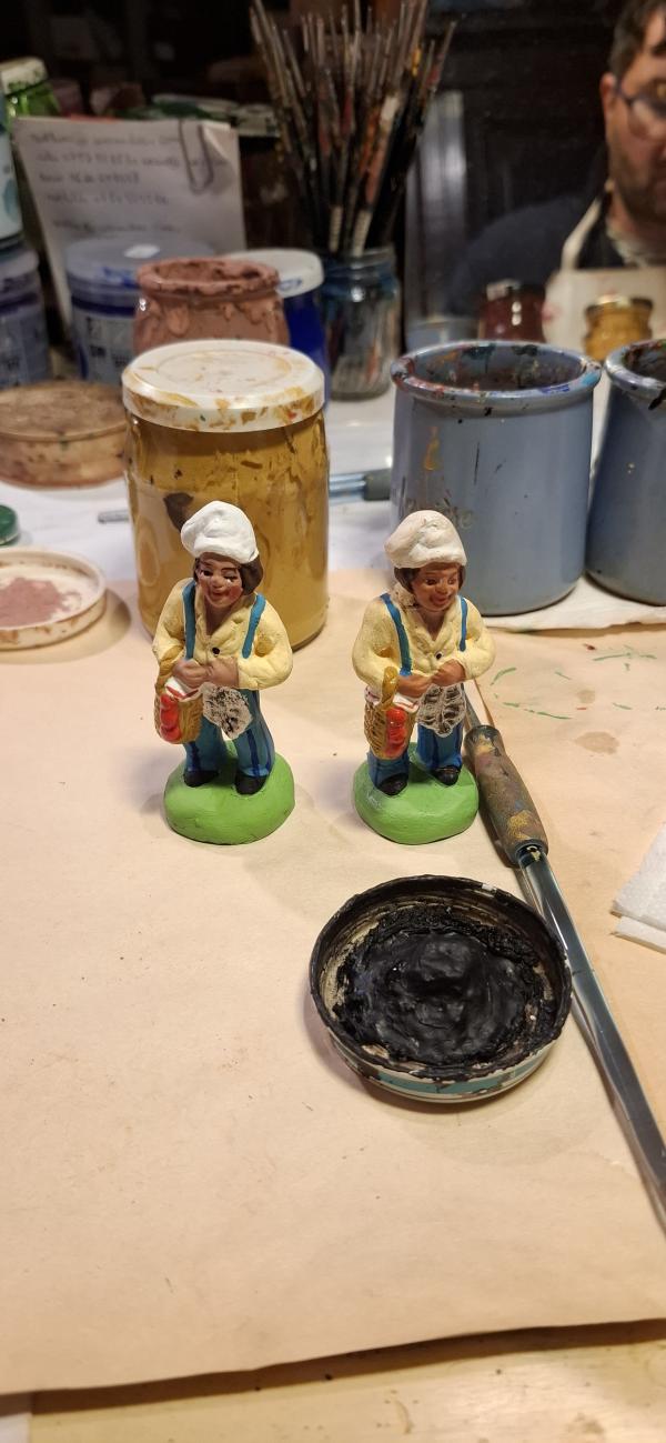 • Ébarbage et préparation : procédez ensuite à l’ébarbage, en nettoyant les aspérités à la main et au pinceau. Une fois les faces lissées et les volumes suffisamment fournis en terre, vos santons patientent jusqu’à la cuisson. Récupérez ensuite deux santons cuits sur le même modèle, prêts à être décorés.