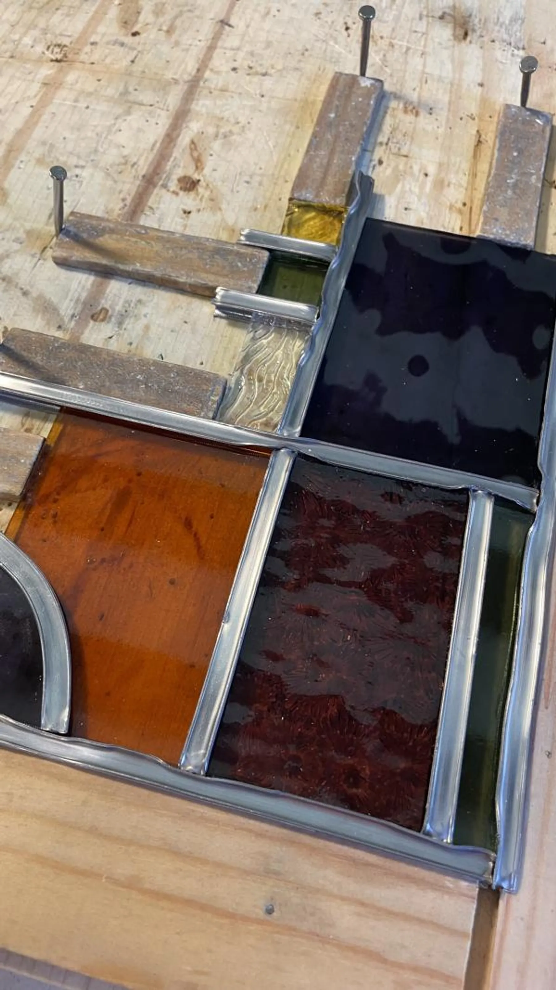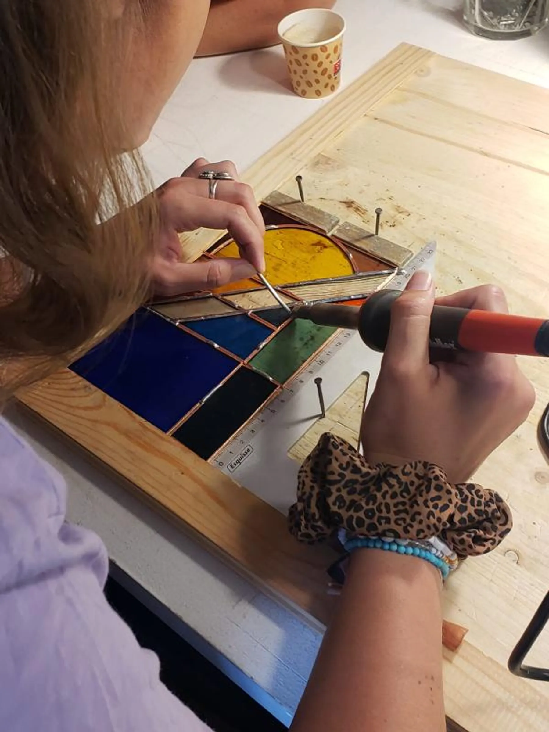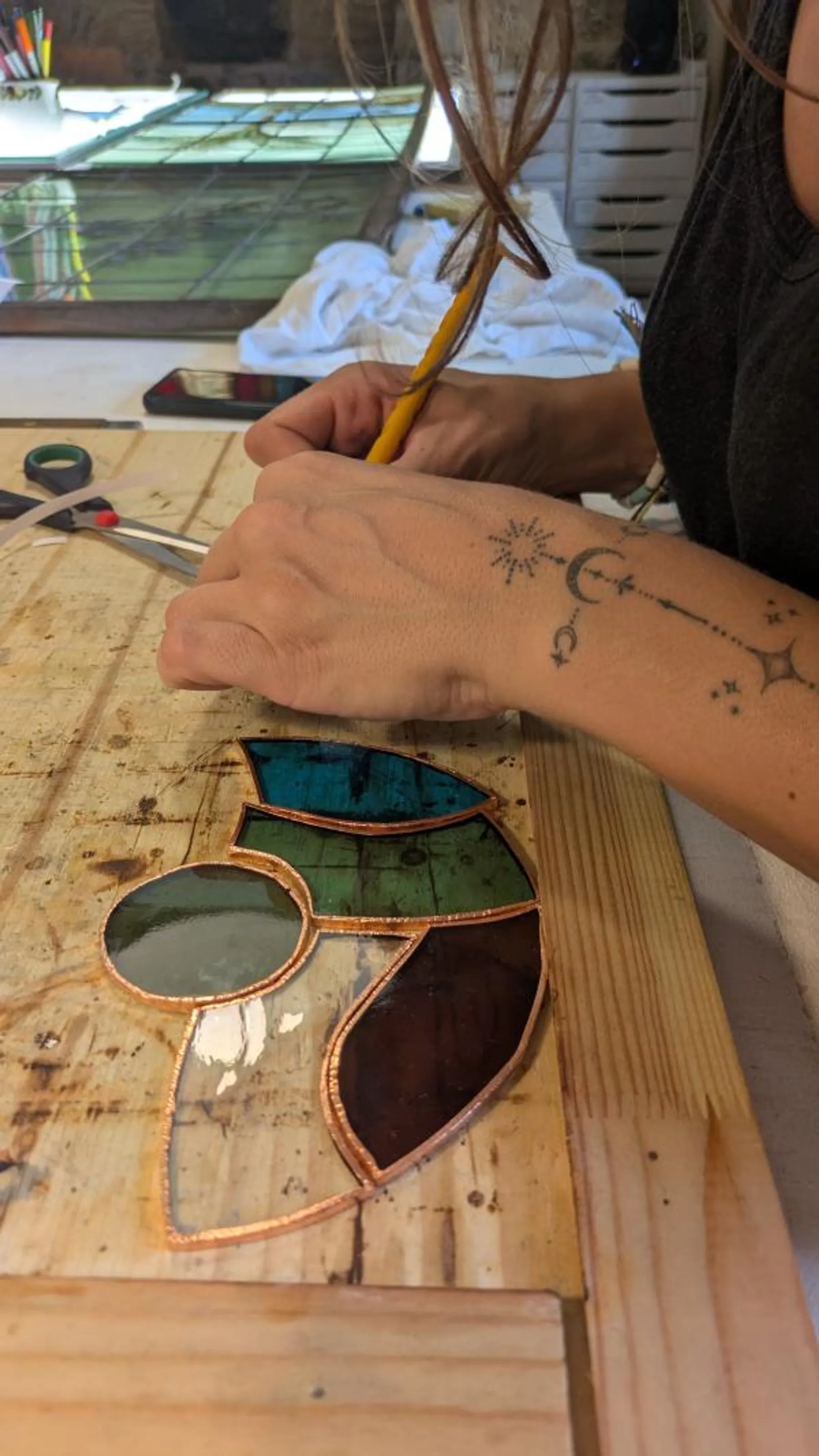 Après avoir tracé votre gabarit, vous découperez les morceaux de verre en suivant votre modèle, puis ajusterez chaque pièce pour un assemblage précis. L’artisane vous accompagnera dans la mise en place des baguettes de plomb et vous initiera aux techniques de soudure des jonctions pour fixer solidement votre composition.