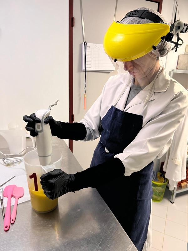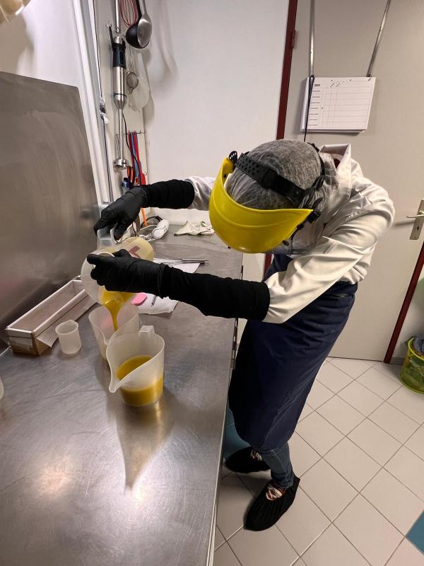 Après cette étape théorique, place à la pratique ! Vous apprendrez à chemiser le moule fourni qui sera utilisé pour couler le savon. Vous irez ensuite dans le labo pour une première réalisation/ démonstration par la savonnière. Cela vous permettra de réaliser ensuite votre propre production en effectuant les pesées, la fonte des matières premières, l'apprentissage de la "trace" et la coulée de votre pâte, toujours sous la bienveillante surveillance d'Agnès.