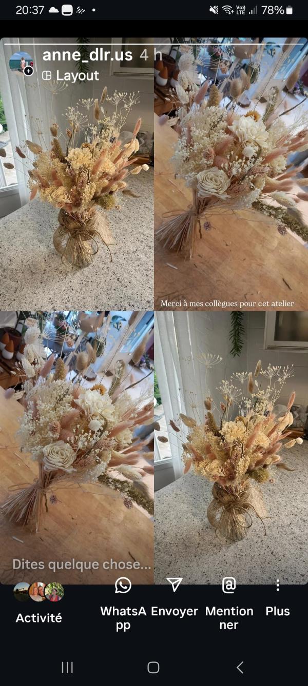 Merciii magnifique moment lors de la création d'un bouquet de fleurs séchées. Techniques, convivialité et beau résultat. Je conseille. Anne