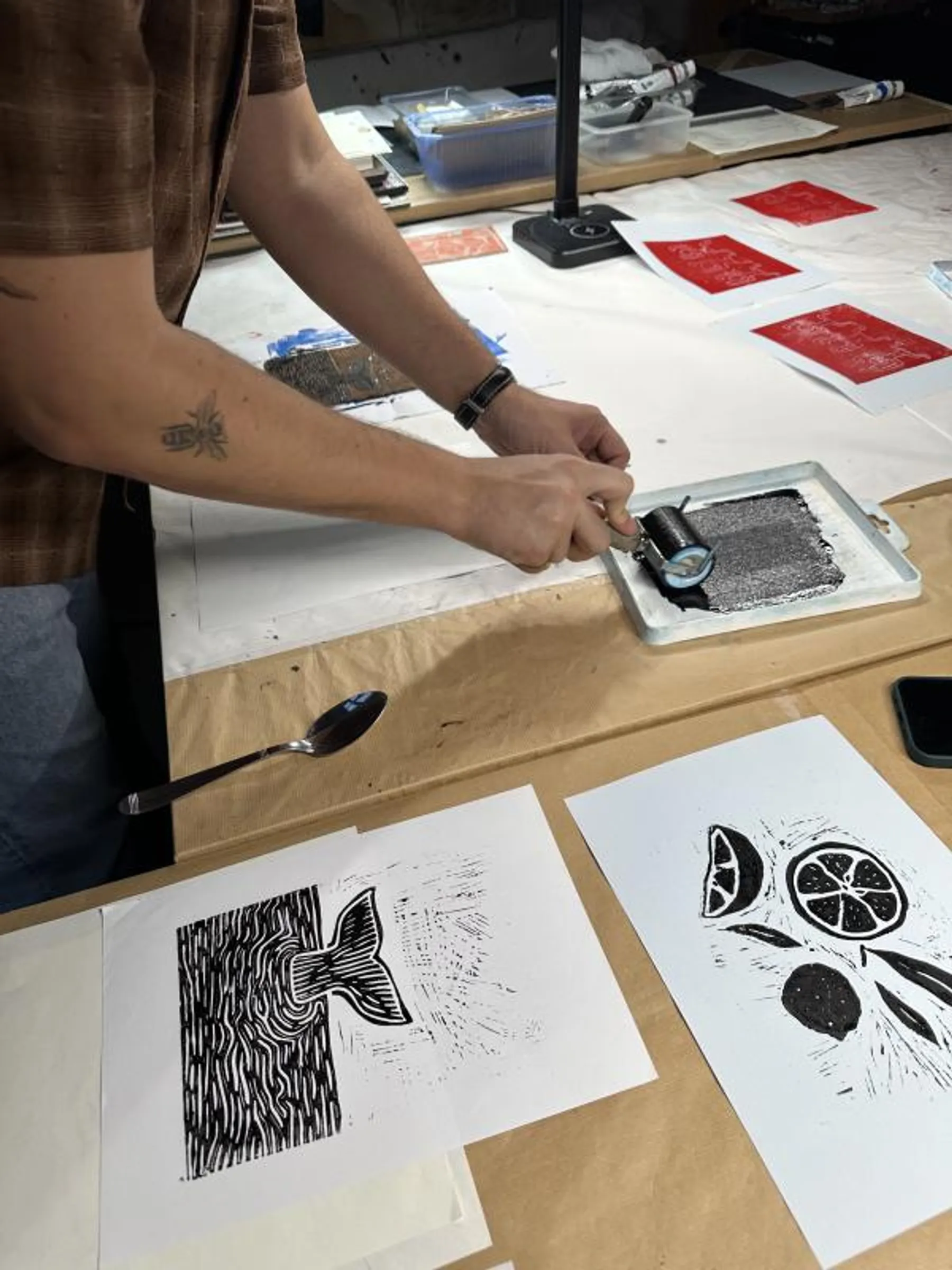 • Encrage : une fois la plaque gravée, encrez-la avec un rouleau jusqu'à ce que toutes les parties en relief soient couvertes uniformément. Testez également différents types de papier et d'encre pour varier les effets.