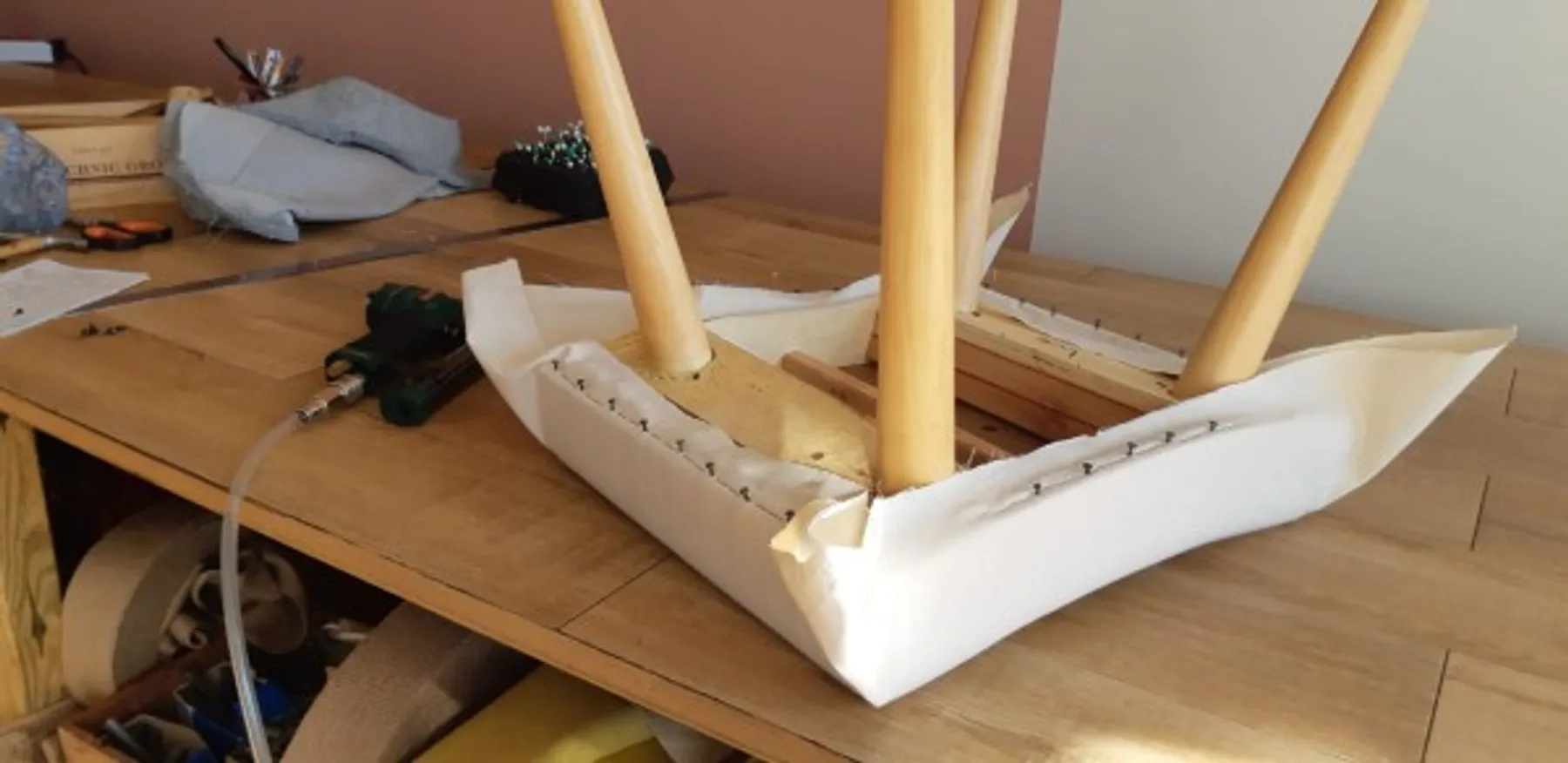 Par la suite, vous apprendrez à appointer la toile blanche et le tissu à l'aide de semences (clous). Enfin, vous gouterez aux joies de l'agrafeuse pneumatique afin de fixer la toile blanche, la ouate et le tissu sur l'assise. Bonne tapisserie !