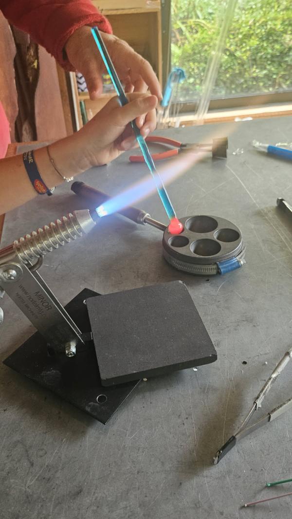 Puis Audrey le guidera pas à pas, à son rythme, pour façonner le verre à la flamme du chalumeau. Ils créeront ensemble la première bille. Puis, sous son regard bienveillant, c’est parti ! Il jouera avec la matière en créant des fils, en modelant les baguettes de verre à chaud et créera sa bille.