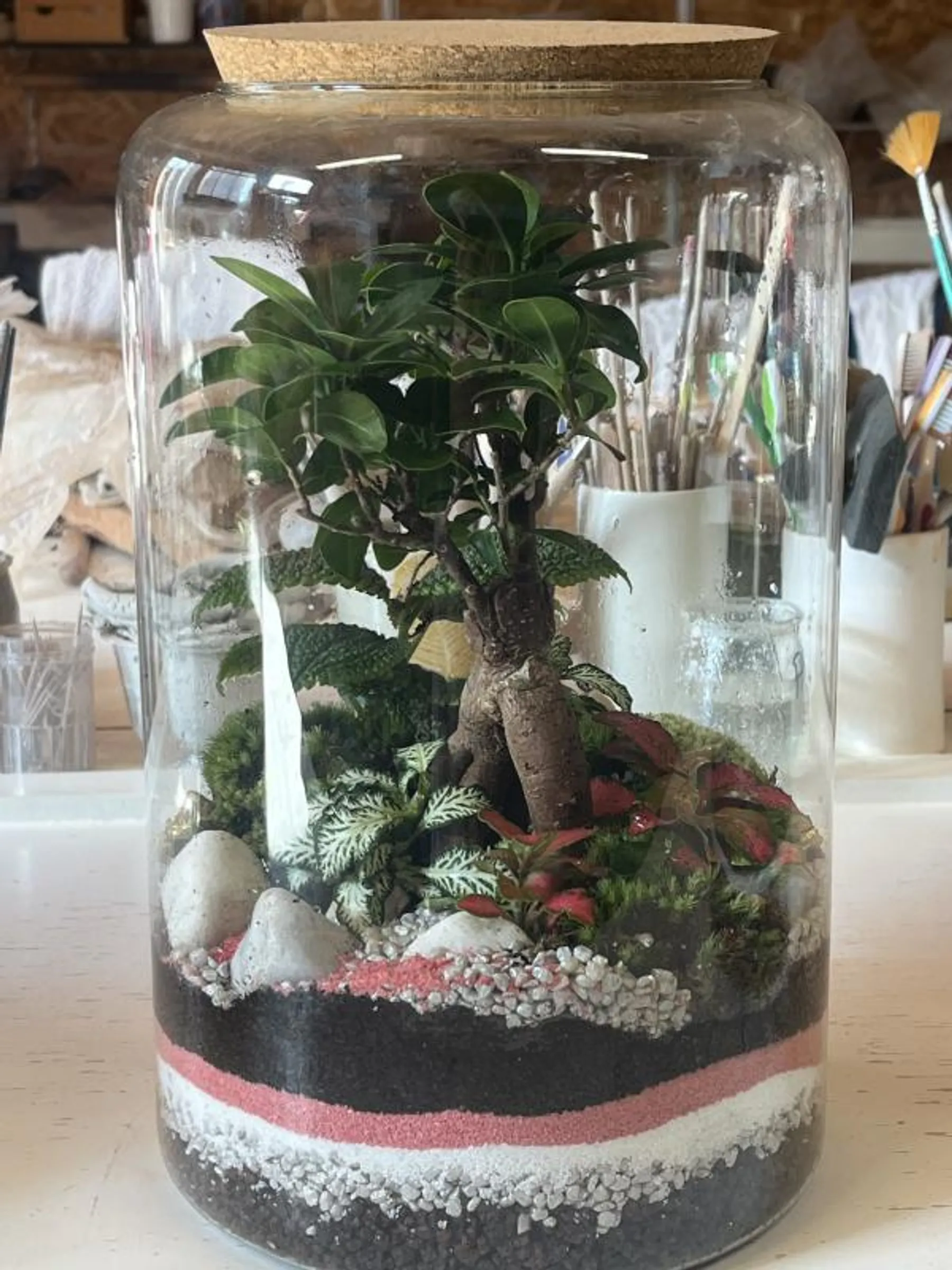 Les galets, subtils éléments de décoration minérale, viendront compléter votre terrarium. Et, enfin, un adorable ficus, véritable pièce maîtresse de ce jardin arboré miniature !