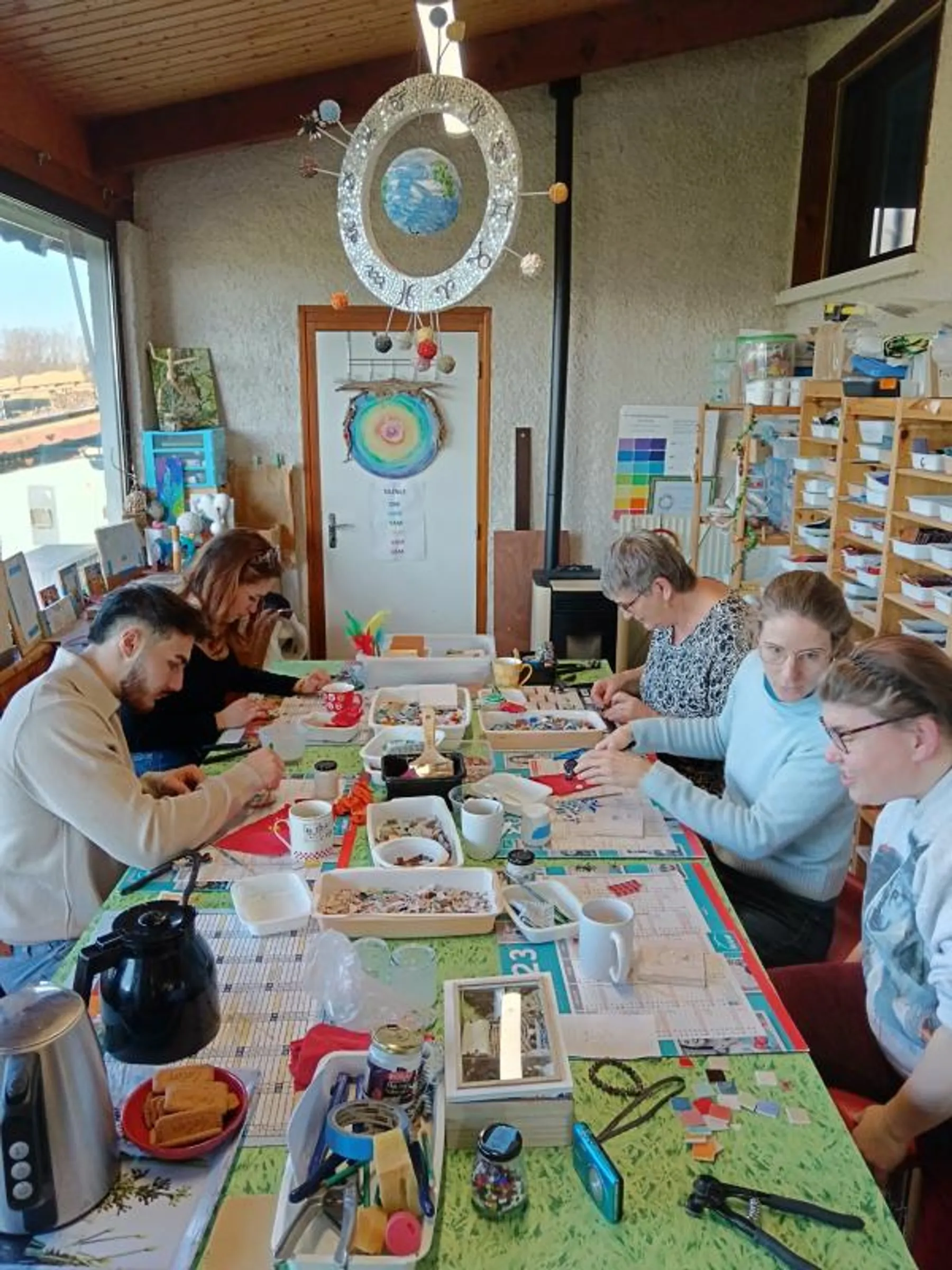 Celle-ci vous accueille dans une véranda baignée de lumière, au cœur d’un jardin verdoyant, bercé par le chant des oiseaux et quelques meuglements pour partager un moment de création hors du temps. Vous aurez l'opportunité de concevoir un mobile décoratif, un bougeoir ou un dessous de verre en mosaïque.