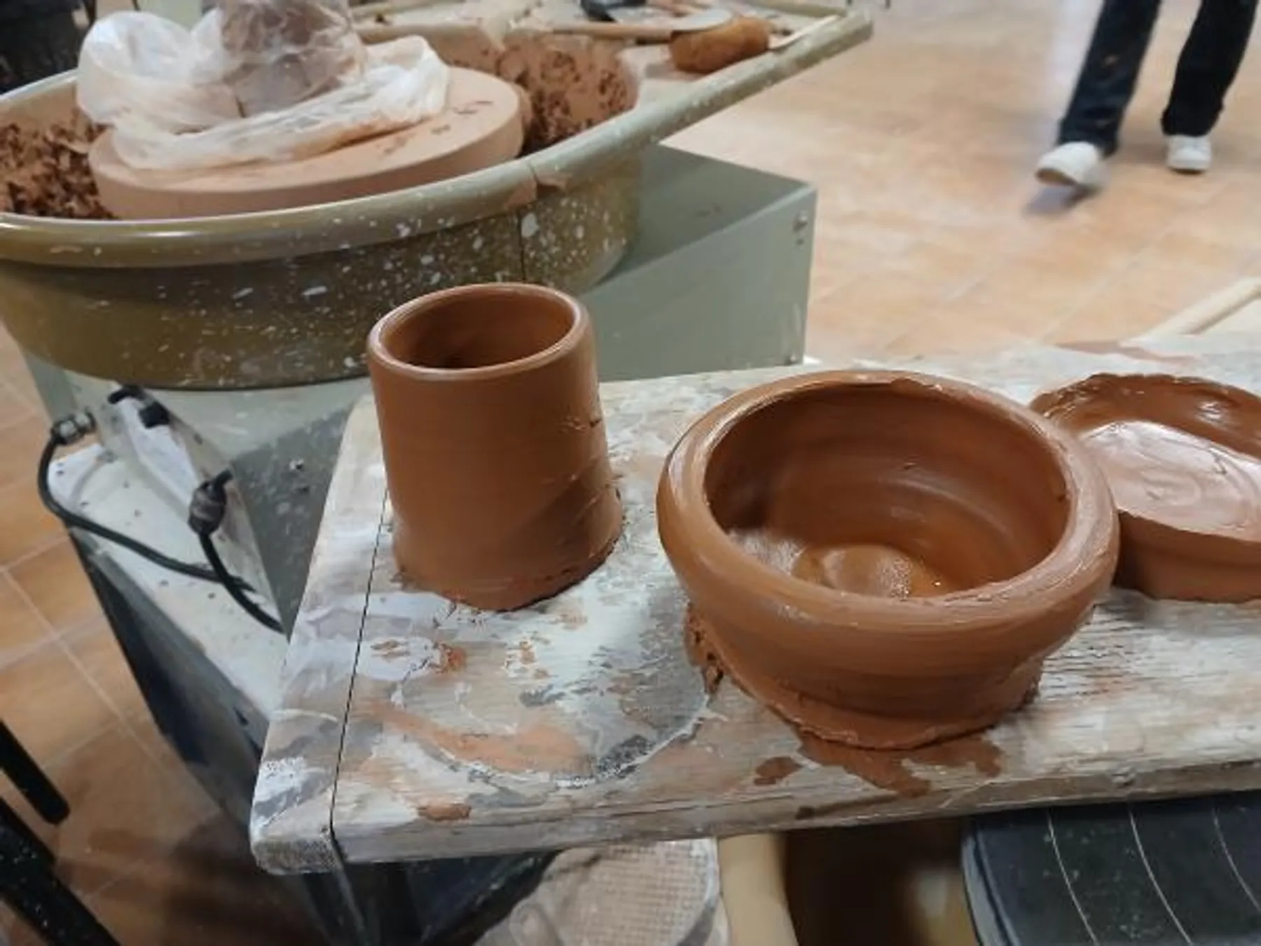 Une fois la terre souple et vos mains échauffées, vous vous installerez sur le tour. Vous monterez une quille pour éliminer les éventuelles dernières bulles d'air, et centrer la terre sur le tour grâce à la force de vos mains ! Toujours accompagné.e, vous verrez peu à peu l'argile prendre forme sous vos doigts, jusqu'à ce qu'elle devienne un bol (ou une autre petite pièce), que vous pourrez sortir du tour.