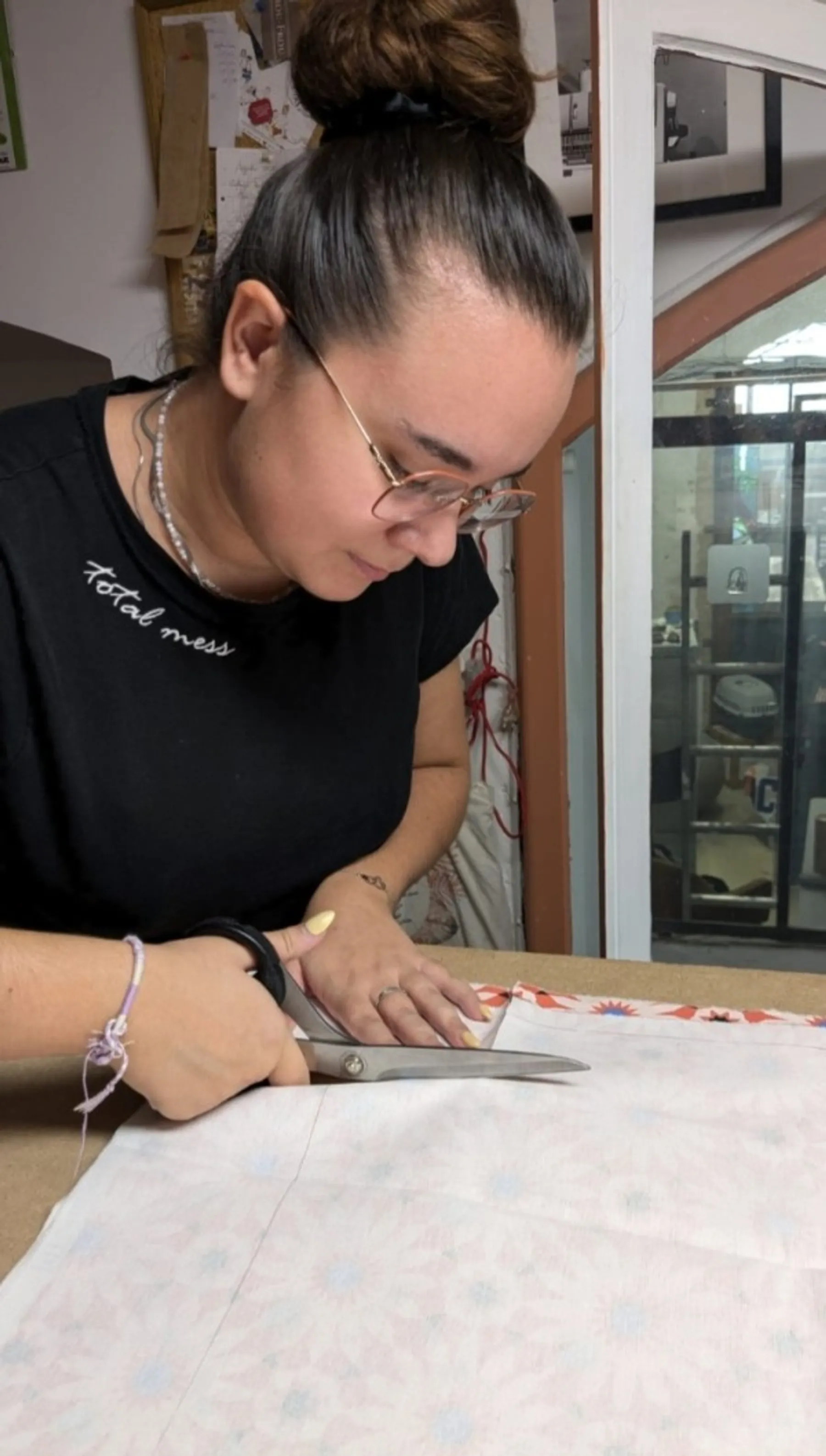Armé de ciseaux, vous commencerez alors à couper votre tissu. Le patron sur carton sera votre guide, et vous suivrez avec concentration les contours pour créer la base de votre sac cabas.