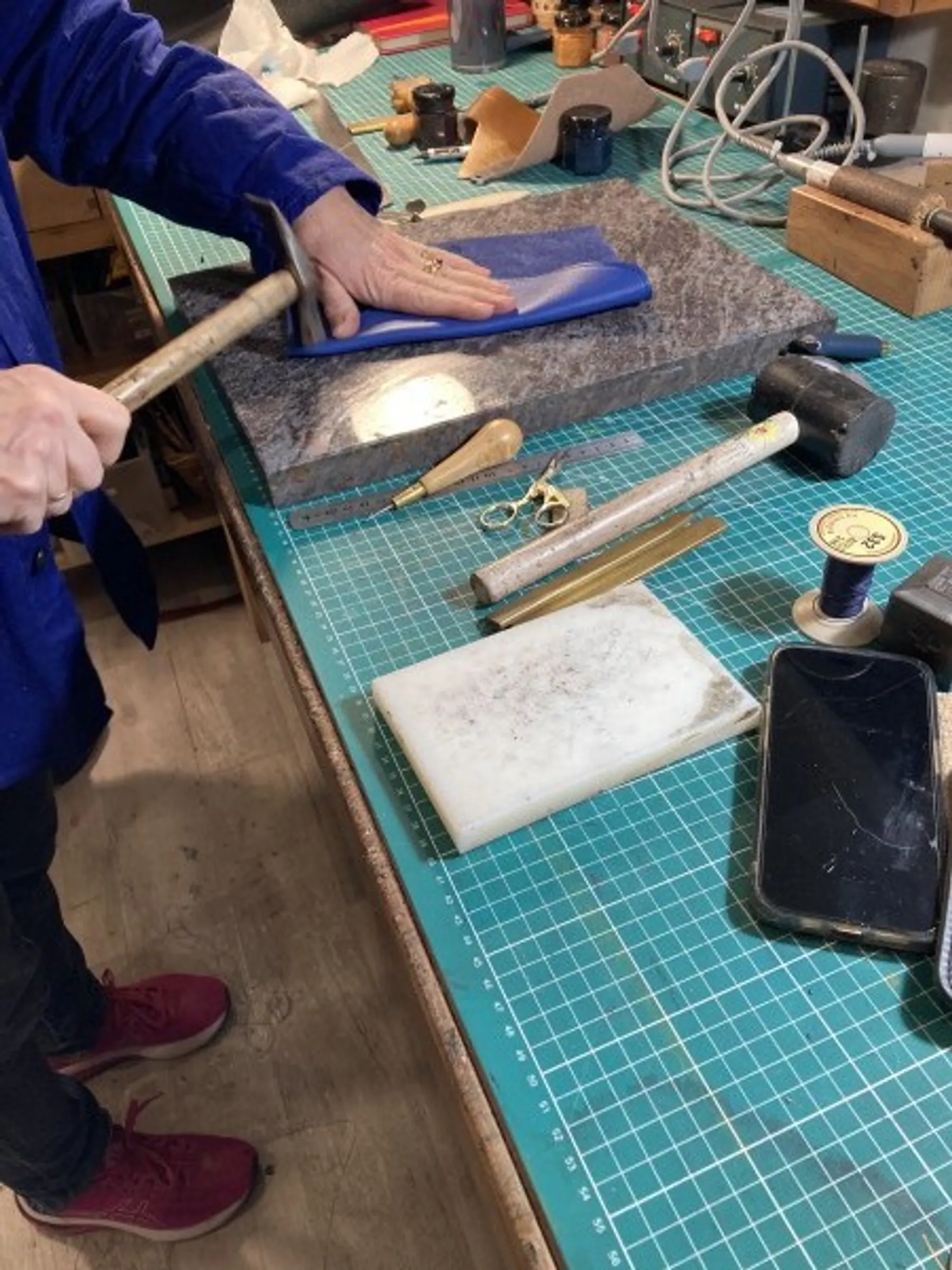 Mélanie vous enseignera la découpe du cuir pour préparer les différentes pièces qui composeront le sac. Puis, vous testerez la machine à coudre le cuir et réaliserez l'assemblage. Si vous n'êtes pas à l'aise avec l'outil, Mélanie vous aidera à assembler les pièces.