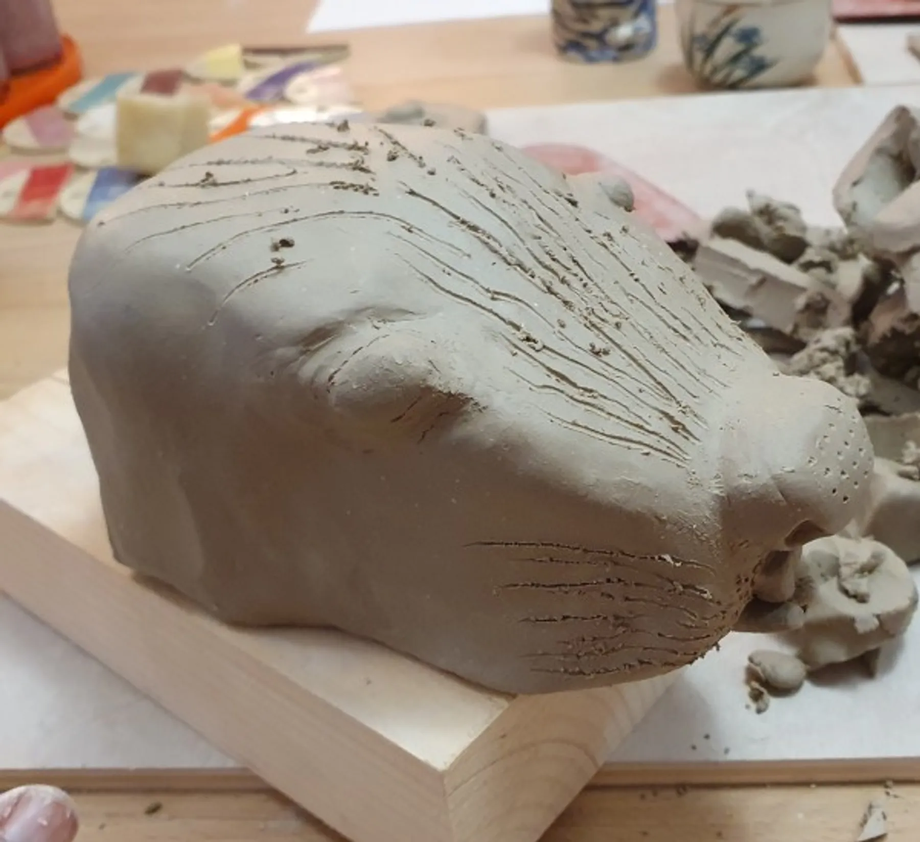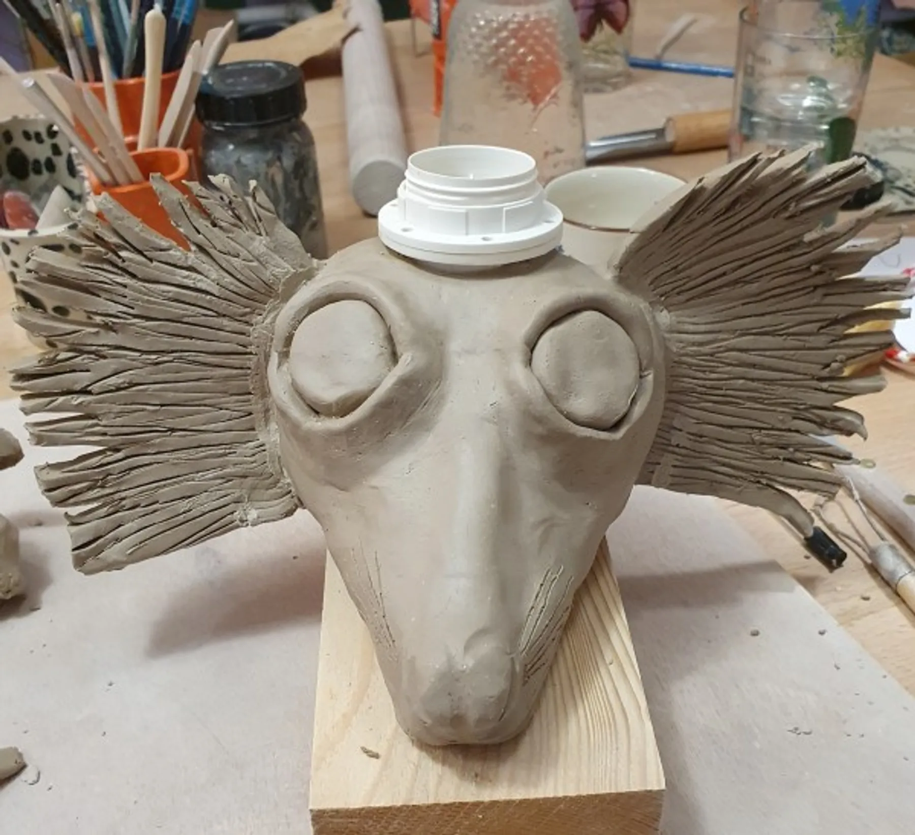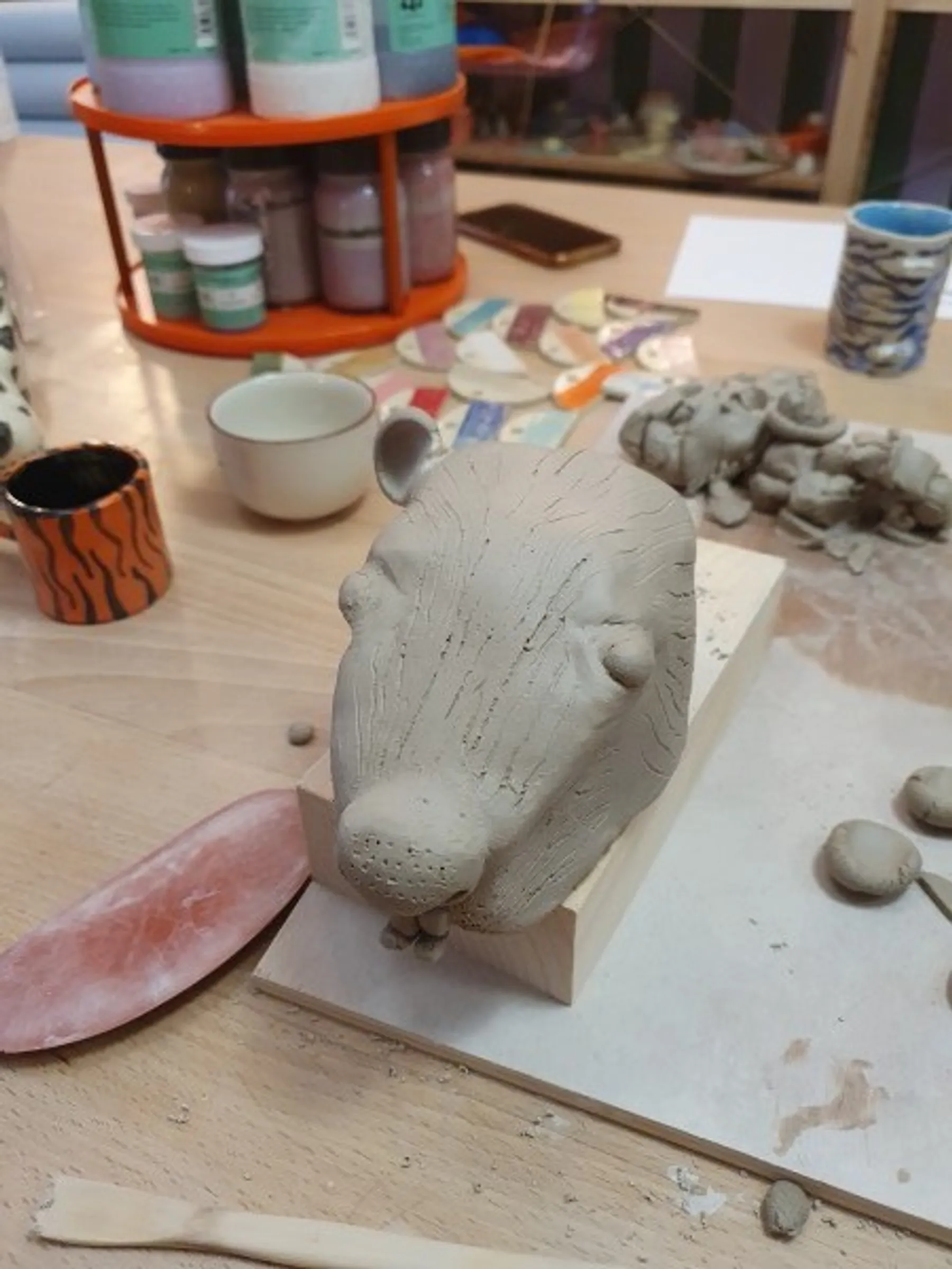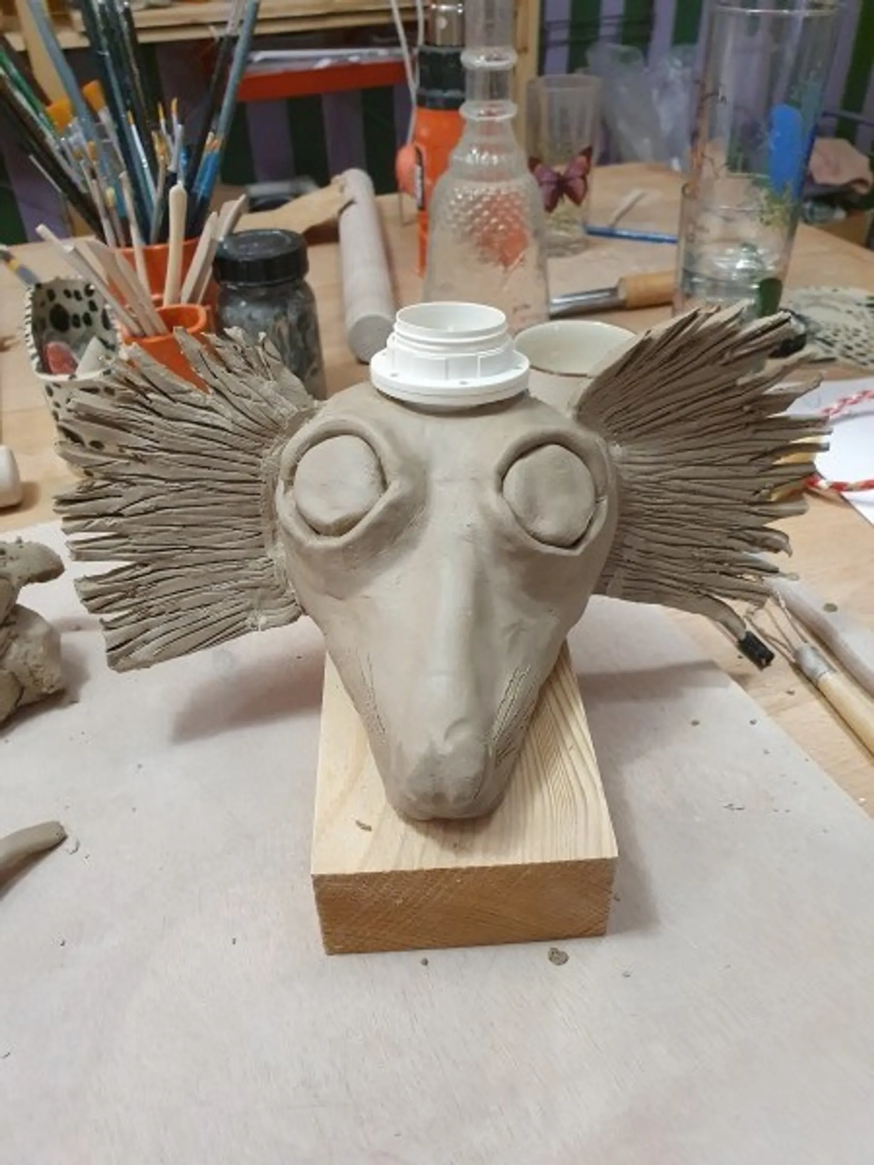 Après avoir donné forme à la tête, vous procéderez au creusage pour la cuisson, puis ajouterez les touches finales. Vous aurez même la possibilité de la personnaliser davantage en la décorant à l'aide d'engobes.